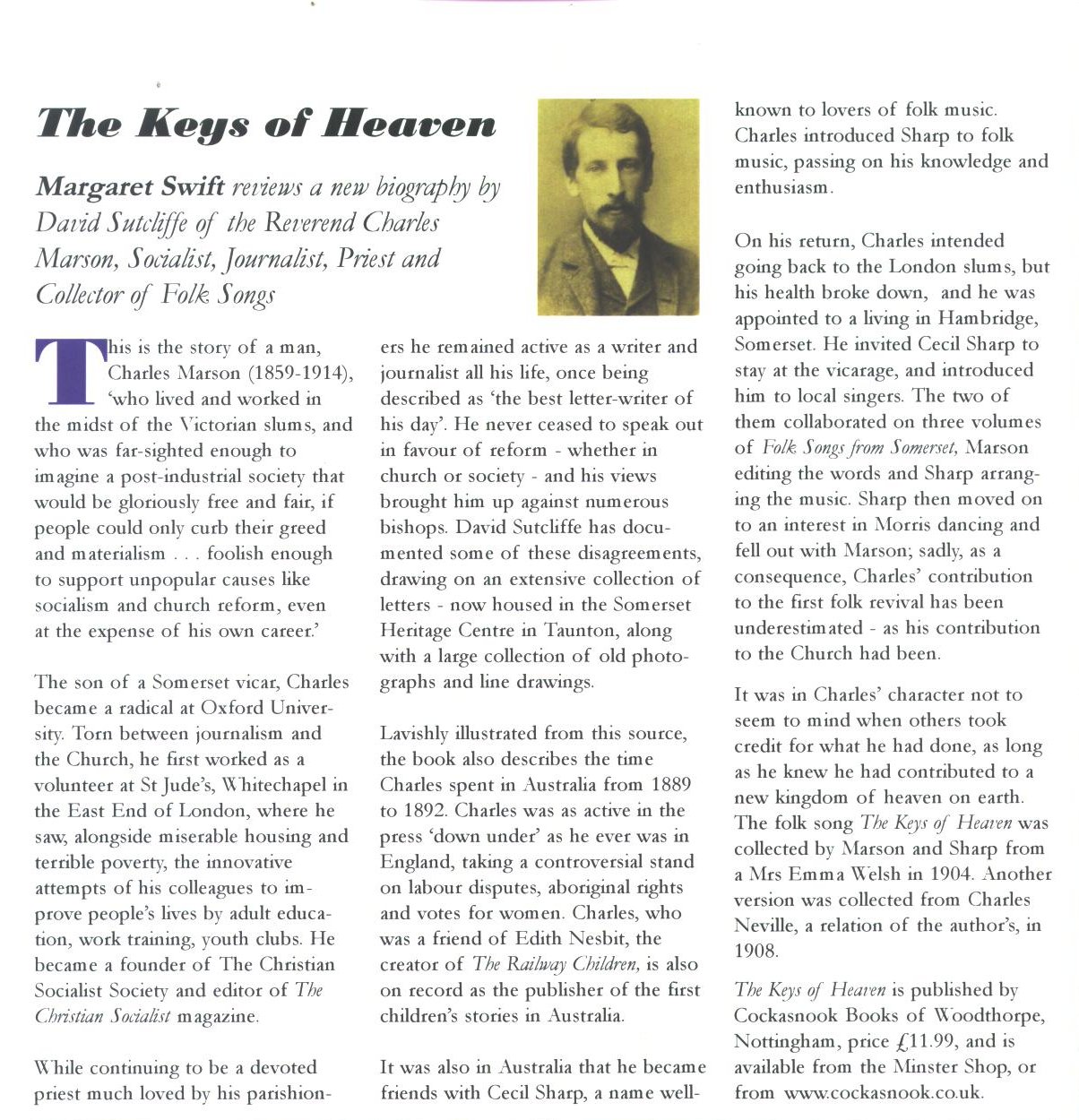 Charles never did seem to mind when others took credit for what he had done, as long as he knew he had contributed to a new kingdom of heaven on earth. The folk song ‘The Keys of Heaven’ was collected by Charles Marson and Cecil Sharp from Mrs Emma Welsh in 1904. Another version was collected from David Sutcliffe’s relation Charles Neville in 1908.